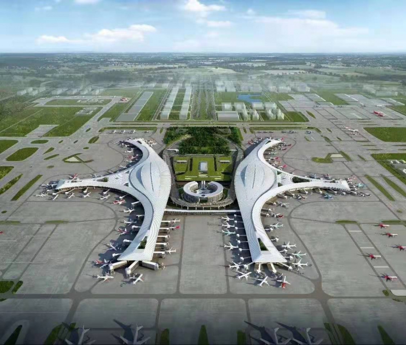成都天府國際機(jī)場(chǎng)一期工程飛行區(qū)等級(jí)為4F,建設(shè)“兩縱一橫”共3條跑道、60萬平方米的航站樓、246個(gè)停機(jī)位以及相應(yīng)的空管工程、供油工程、航空公司基地工程等設(shè)施。